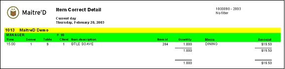 Maitre'D item correct detail report provides you with a list of all the items that were removed from server's tables by manager before they were ordered for the selected date or period of time per manager. From the report filter window, select the date, revenue center and employees to be included in the report. The following is a sample of the item correct detail report: