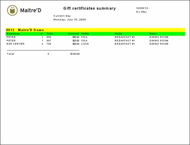 Maitre'D gift certificate report provides you with a list of all gift certificates sold for the selected date or period of time, employees and Revenue Centers. From the report filter window, select the appropriate date or period of time, Revenue Center and employees to be included in the report. The following is a sample of the gift certificate report: