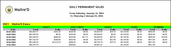 Maitre'D's Daily Permanent Sales Report shows you the same non-resettable totals as the Permanent Report, but on a daily basis. It acts like a journal printer and keeps running sales since the beginning of the restaurant's operation. The following is a sample of the Daily Permanent Sales report: