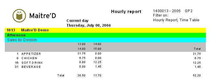 Here is an example of the sales by division hourly report: