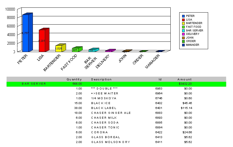 Maitre'D item report per employee shows the total $ amount sold for each employees and the number of items with the description