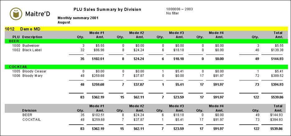 The following is a sample of the PLU sales summary by division report: