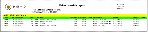 Maitre'D price override report provides all items ordered for a specific time frame. From the report filter window, select the date and time range, tables and employees to be included in the report. The following is a sample of the price override report: