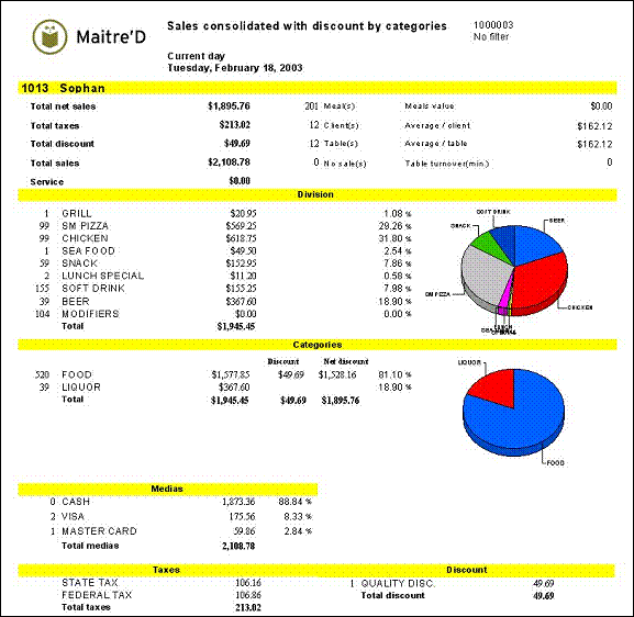 Maitre'D Sales Consolidated with Discounts by Categories report shows the restaurant's sales and discount information.