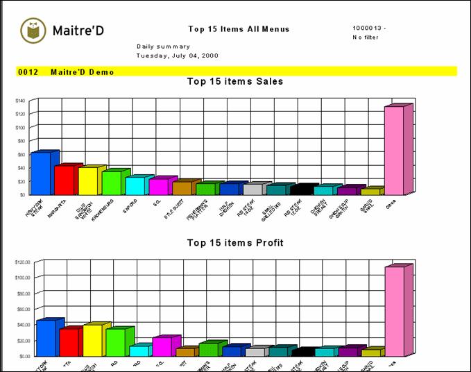 Maitre'D Top 15 items consolidated Report shows information of top 15 items of all Revenue Centers condensed together, for the date or the period of time requested. From a report filter window, you select the appropriate date or date range, categories, divisions, Revenue Centers and modes for which you need information. The following is a sample of the Top 15 items consolidated report: