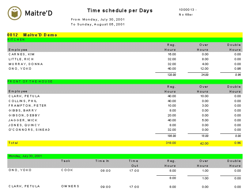 Maitre'D schedule per days report shows information on the scheduled hours for each T&A department with the employee name and assigned hours for the current week or the next week. It gives you each employee's schedule sorted date.