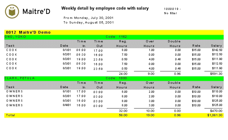 Maitre'D weekly detail by employee code with salary shows information on each employee time sheet with a summary of worked hours and payable salary for a specific week or date range. This report is sorted by T&A employee code. From the report filter window, select the appropriate week or custom date, the employee(s) to be included in the report.