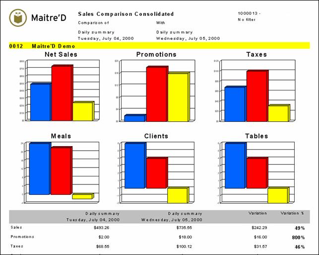Maitre'D Sales Comparison consolidated report compares net sales, promotions (discounts), taxes, service, the quantity of meals sold, the amount of clients served and the quantity of tables served between 2 specific dates or 2 specific period of time. From a report filter window, you select the appropriate dates or date range, Revenue Center and mode for which you need information. The following is a sample of the Sales comparison consolidated report: