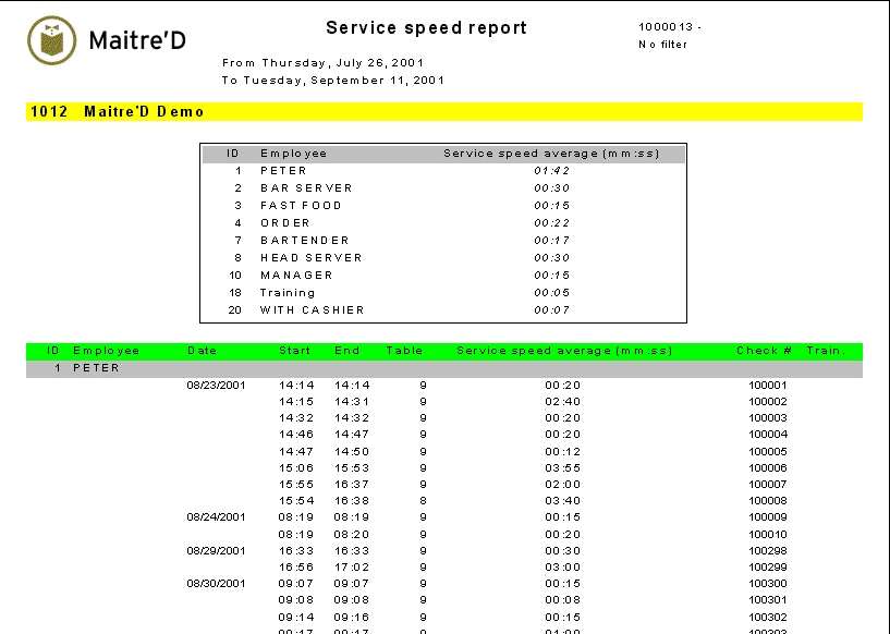 Maitre'D's Service Speed report shows you delay average in time (in seconds) for each item ordered on each check by employee. From the report filter window, select the date range, employees, to be included in the report.