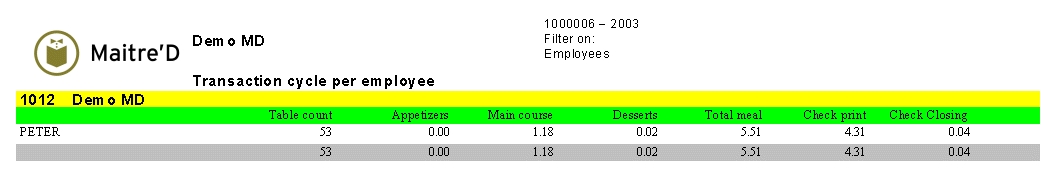 Maitre'D's transaction cycle per employee report shows you delay average in minutes for each stage of the meal by employees according to your specifications. From the report filter window, select the date and time range and employees to be included in the report.