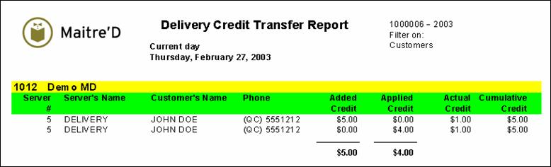 Maitre'D mailing labels report uses powerful filters to generate specific list of customer mailing labels. From the report filter window, select the date, customers and employees to be included in the report. The following is a sample of the delivery credit transfer report: