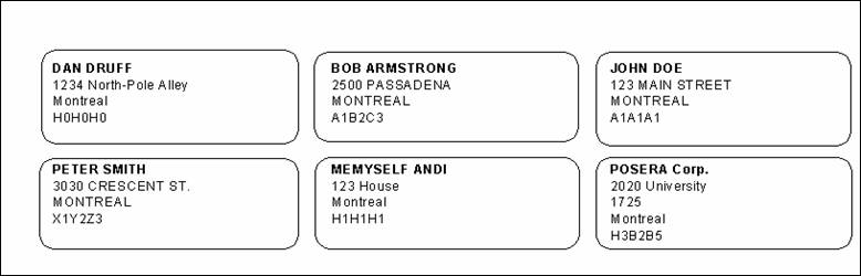 Maitre'D mailing labels report uses powerful filters to generate specific list of customer mailing labels. From the report filter window, select the dates, customers, amounts, order count, invoices, employees, items, promotions, media, Revenue Centers, and modes to be included in the report. The following is a sample of the mailing labels report: