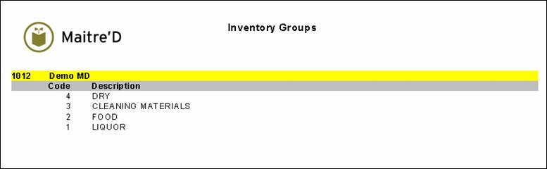 Maitre'D's groups report shows you all groups used to organize inventory categories. The following is a sample of the groups report: