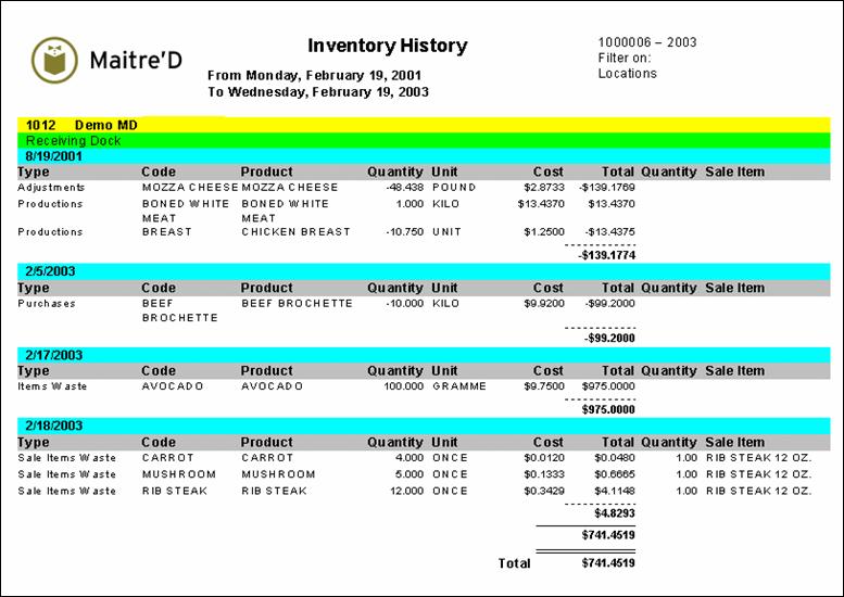 Maitre'D's history report shows you the history of actions that affected the inventory quantities according to your specifications. From the report filter window, select the dates, locations, items, categories and groups to be included in the report. The following is a sample of the history report: