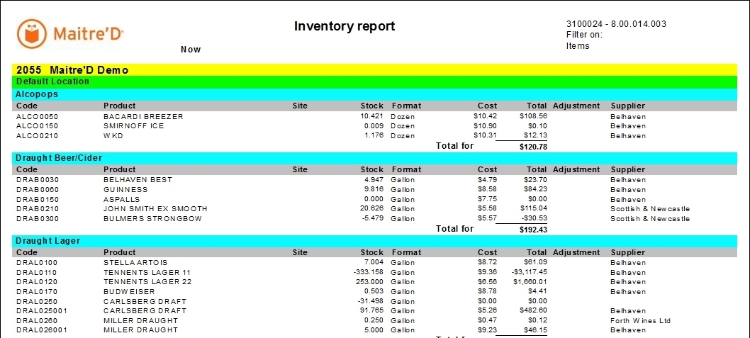The report is divided by inventory location within the restaurant. If there is only one location, the green bar will say “Default location”. Otherwise, the name of each location will appear in the report.