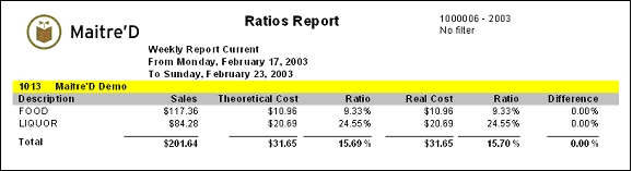 Maitre'D ratios report shows both the theoretical and real cost, in money value and in percentage compared with the sales. From the report filter window, select the time period to be included in the report. The following is a sample of the ratios report: