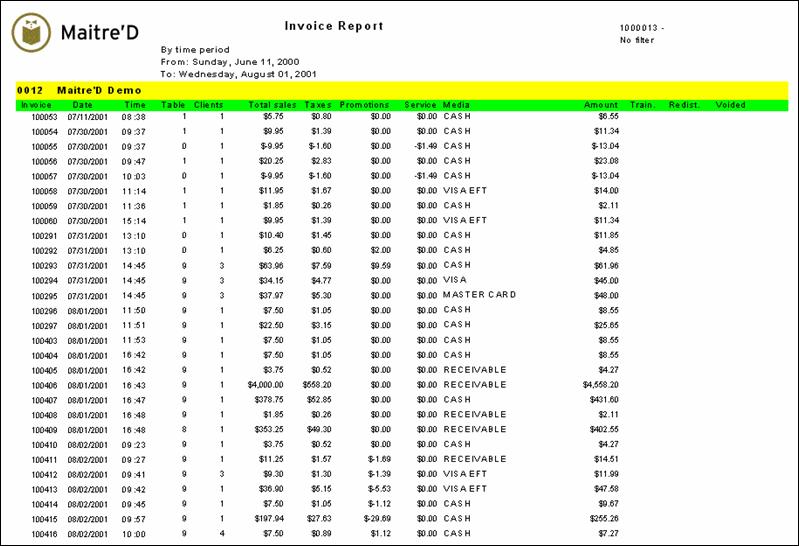 Maitre'D by time period report is an invoice report that provides all invoices (checks) for a specific time frame. From the report filter window, select the date and time range and employees to be included in the report. The following is a sample of the by time period report: