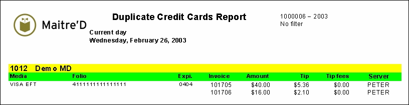 Use the Duplicate Media report to trace efficiently duplicate of credit card used during a specific period of time. This report is a powerful tool to make sure that server did not use the same credit card for several check by mistake. Take note each media type must have the field "included in report" enabled to show up on the duplicate media report. From the report filter window, select the appropriate date and time range, Revenue Centers, media and employees to be included in the report. The following is a sample of the duplicate media report: