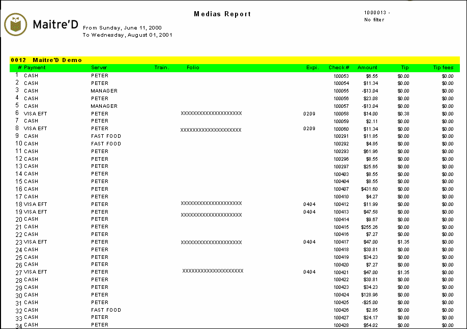Maitre'D medias report provides you with a list of all invoices and their type of payment(s) used to close them for the selected date or period of time. It reports the employee associated to the invoice $ amount and any tip amount. Take note each media type must have the field "included in report" enabled to show up on the media report. From the report filter window, select the appropriate date and time range, Revenue Center, media type and employees to be included in the report. The following is a sample of the medias report: