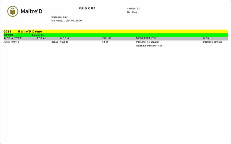 Maitre'D paid out report provides you with a list of all the paid out for the selected date or period of time per employees. From the report filter window, select the appropriate date or period of time, Revenue Center and employees to be included in the report. The following is a sample of the paid out report: