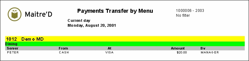 Maitre'D payments transfer by Revenue Center report provides you with a list of all payments transfer done on server readings by Revenue Center for a selected date or period of time. From the report filter window, select the appropriate date, employees, media and Revenue Centers to be included in the report. The following is a sample of the payments transfer by Revenue Center report: