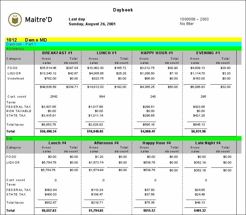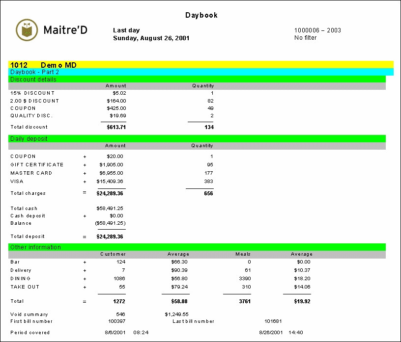 Maitre'D's Daybook report shows you sales details, by modes and by Revenue Centers, on the first pages, as well as discount details, deposit details, and statistics, on a last page. From the report filter window, select the appropriate date to be included in the report. It is also possible to force the user to enter the deposit amount before they can run the EOD. If you wish to do so, the "Daily deposit" option under P.O.S. Control / View / Option must be enabled. The following is a sample of the daybook report: