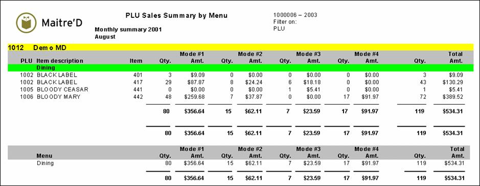 The following is a sample of the PLU sales summary by Revenue Center report: