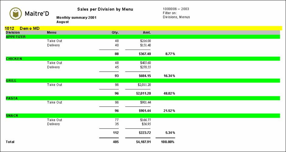 Maitre'D sales per division by Revenue Center report shows division information by Revenue Center for the date or the period of time requested. From the report filter window, select the appropriate dates, Revenue Centers and divisions to be included in the report.