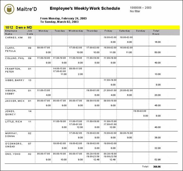 Maitre'D employee's weekly work schedule report shows information on the scheduled hours for each employee, job code, scheduled time in/out and assigned hours for the current week or the next week. It gives you each employee's schedule divided by weekday. From the report filter window, select the current week or next week and the employees to be included in the report. The following is a sample of the Employee's Weekly Work Schedule report