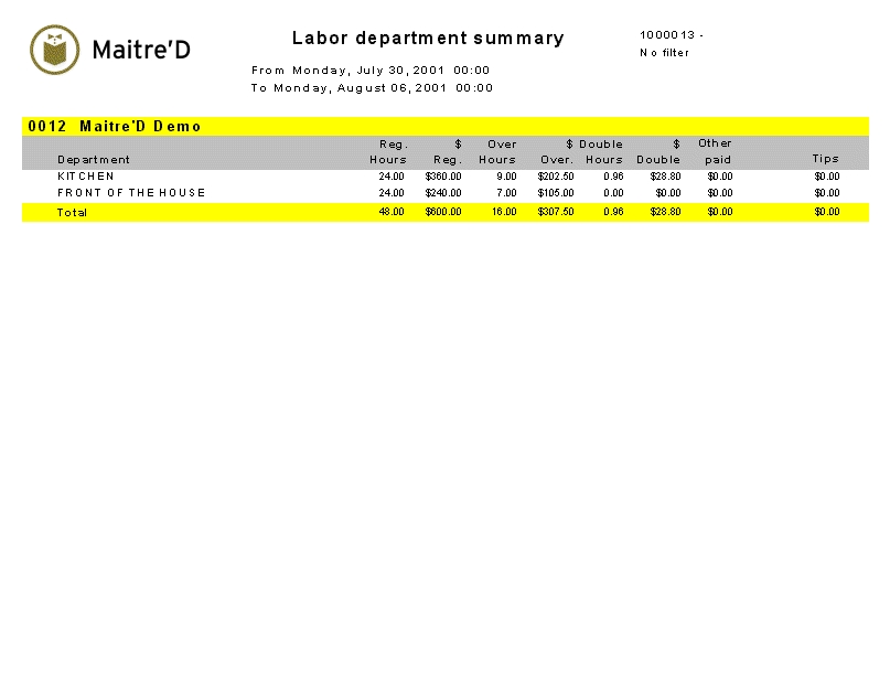 Maitre'D labor department summary report shows detailed information such as the regular hours, overtime, and double hours for each T&A department and its payable salary. From the report filter window, select the appropriate week or custom date to be included in the report.