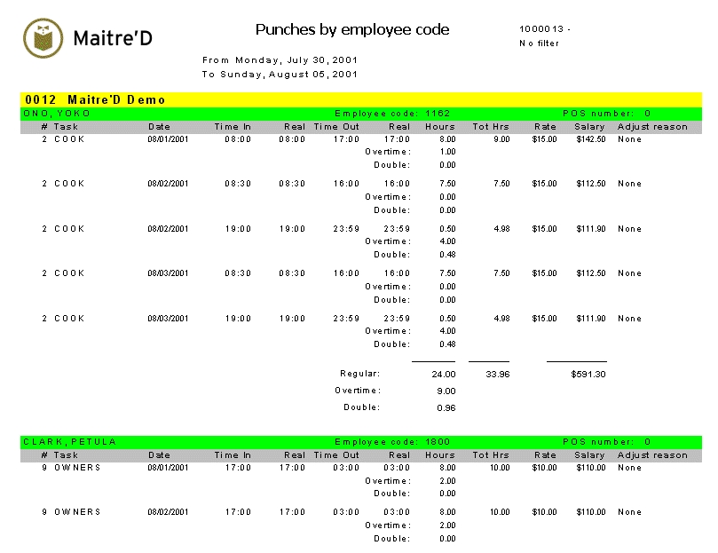 Maitre'D punches by employee code report gives information on all the punches that were done for specific period of time. This report is sorted by employee code from the POS Control module. This report shows detailed information such as the regular hours, overtime, and double hours worked for each employee. You also get information on their hourly rate and paid salary. From the report filter window, select the date or date range and the employee(s) to be included in the report.