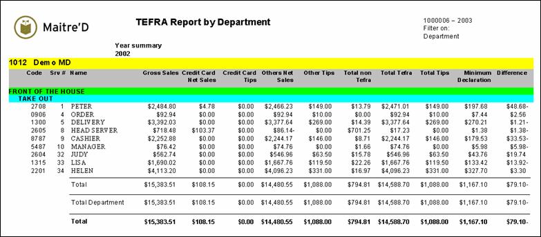 Maitre'D TEFRA by department report gives information regarding the credit card sales, credit card tips, other net sales and other tips for each employee, as well as a total by department and for the whole restaurant. This report is used to ensure that employees are claiming the tips required by the law. This report is sorted by server code from the POS Control module. From the report filter window, select the dates, departments, tasks and employees to be included in the report. NOTE: Maitre'D does not report employee under training. TEFRA stands for Tax Equity and Fiscal Responsibility Act. The following is a sample of the TEFRA by Department report