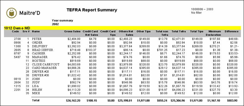Maitre'D TEFRA summary report gives information regarding the credit card sales, credit card tips, other net sales and other tips for each employee. This report is used to ensure that employees are claiming the tips required by the law. This report is sorted by server code from the POS Control module. From the report filter window, select the dates and employees to be included in the report NOTE: Maitre'D does not report employee under training. TEFRA stands for Tax Equity and Fiscal Responsibility Act. The following is a sample of the TEFRA summary report
