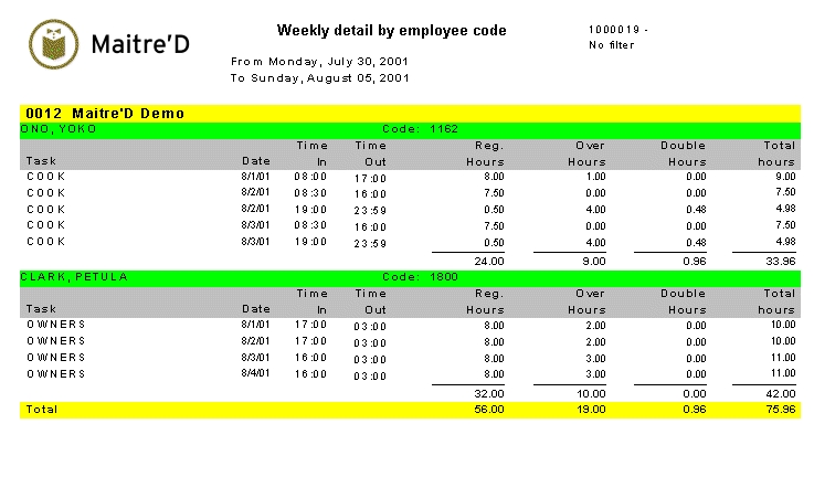 Maitre'D weekly detail by employee code shows information on each employee time sheet with a summary of worked hours for a specific week or date range. This report is sorted by T&A employee code. From the report filter window, select the appropriate week or custom date, the employee(s) to be included in the report.