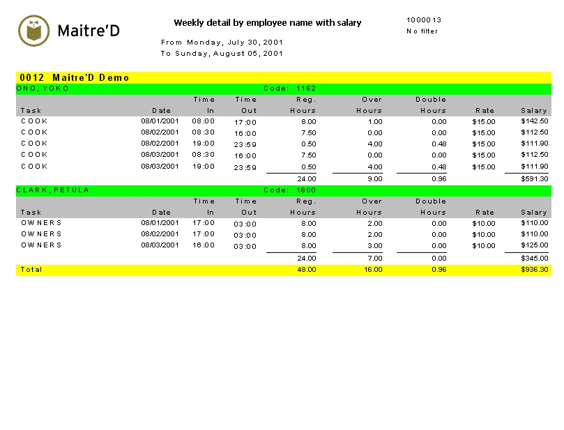 Maitre'D weekly detail by employee name with salary shows information on each employee time sheet with a summary of worked hours and payable salary for a specific week or date range. This report is sorted by T&A employee name. From the report filter window, select the appropriate week or custom date, the employee(s) to be included in the report.