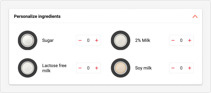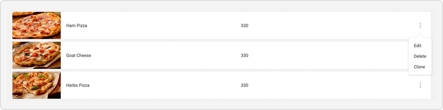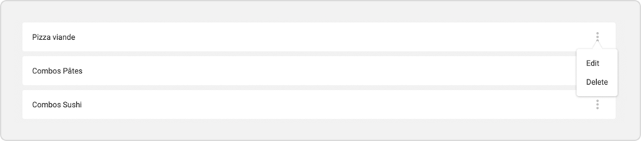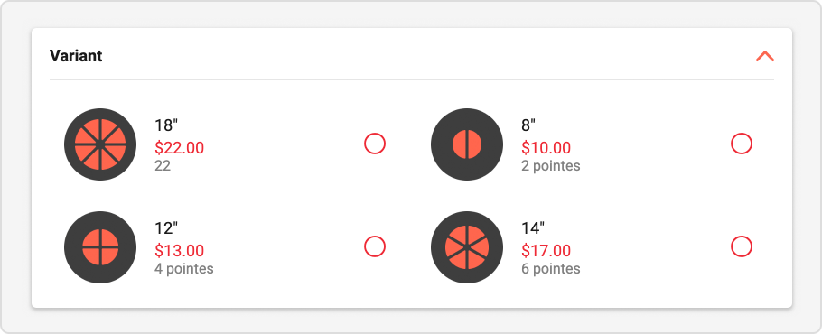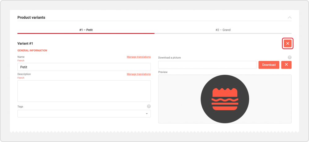 A product can be offered in several formats: Starter / Meal, Quantities, etc. For each format, we can create a variant for the same product which will be available on the page of the selected product. A price and an image can be assigned to the variant. A variant must be selected by the user for the product to be added to the current order.