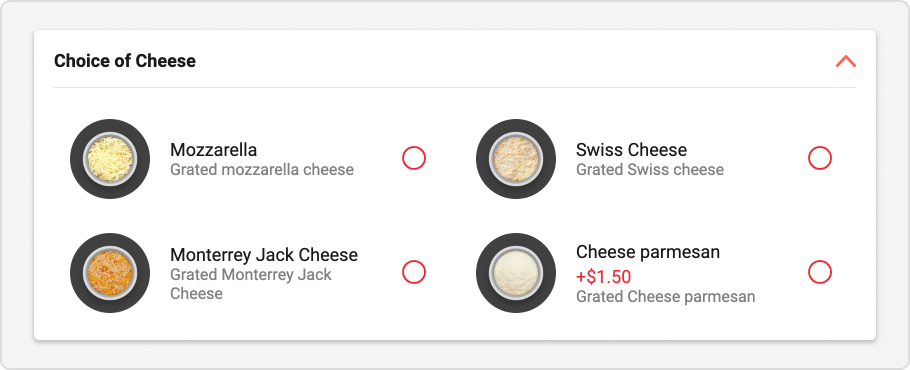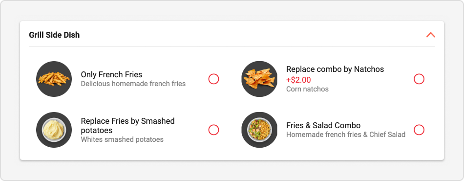 Choice products are additional products or ingredients with which a product must be ordered. It can be a side dish (salad, fries, etc.), a type of cooking (rare, well done, etc.), a flavor (apples, oranges, etc.), a brand (Pepsi, Crush, 7Up, etc.), etc.
