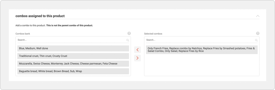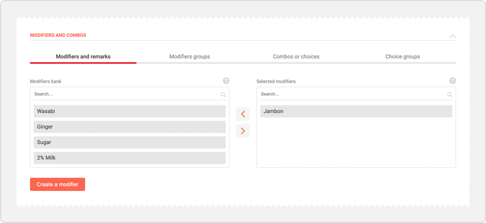 Use the Modifiers and remarks bank to choose the desired modifier. Then click on the arrows to bring the selected modifiers to the product's modifiers bank. Use the search box to easily find the modifier you want.