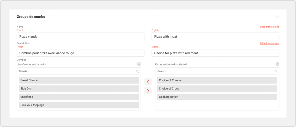 In order to ensure a menu which will be coherent with your POS system, it will have to be composed with a certain hierarchy and "interlocking" which is at the base of the iShopfood structure. This structure will ensure good navigation in the categories, and will allow the customer to choose his extras, combo and variant for different products, in different categories.