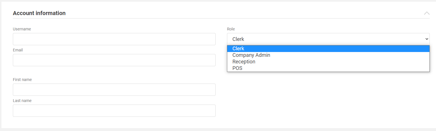 Create a user with the desired authorization level: Employees (Quick configuration: ON), Compagny Admin (Full navigation menu), Reception (Quick configuration: OFF), POS (external POS from the IshopFood backend, this mode is very specific .)