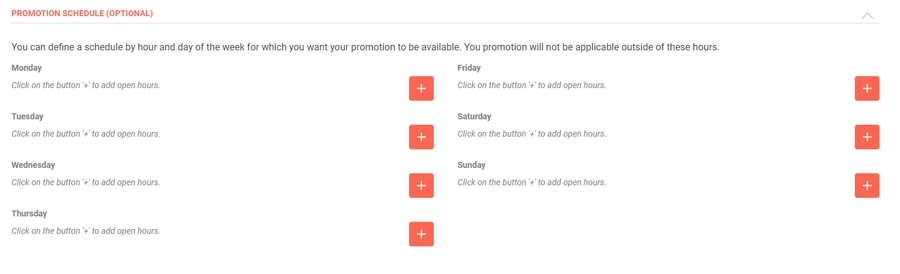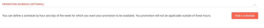 You can set a schedule per hour and day of the week for which you want your promotion to be available. Your promotion will not be applicable outside of these hours.